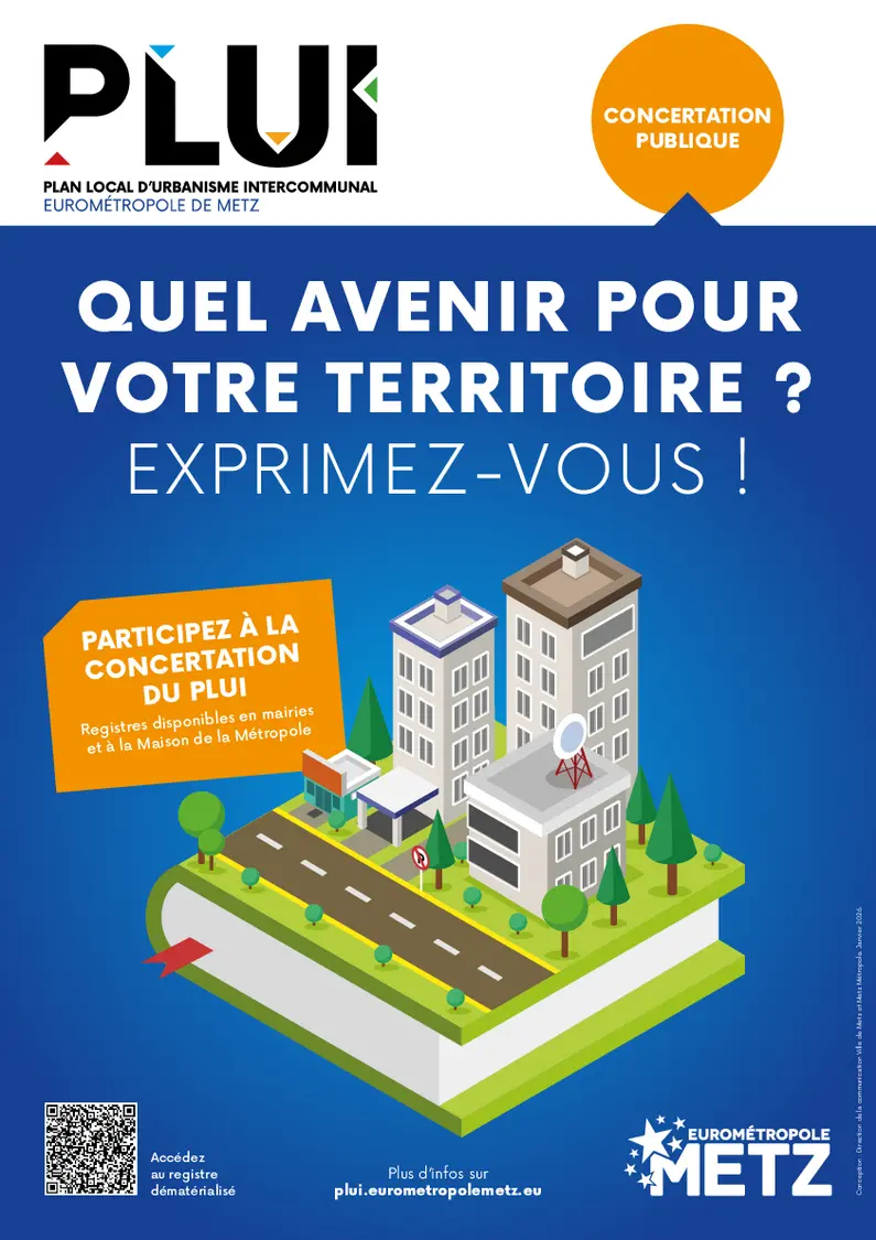 Vous êtes invités à vous exprimer, sur la procédure, le futur projet ou tout autre sujet en lien avec le PLUi. Des registres sont disponibles en mairies des communes, dans les mairies de quartier de Metz ainsi qu’à la Maison de la Métropole aux horaires habituels d’ouverture. Un registre dématérialisé est également accessible via le site du PLUi (plui.eurometropolemetz.eu) et via la plateforme ConnectMetz (services.eurometropolemetz.eu).